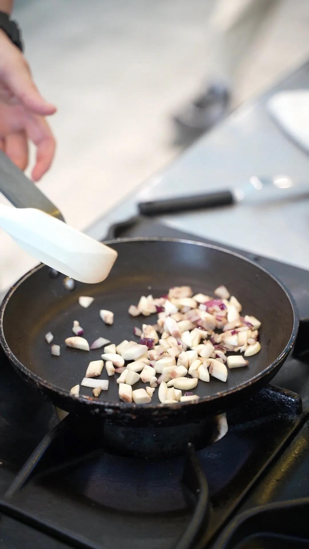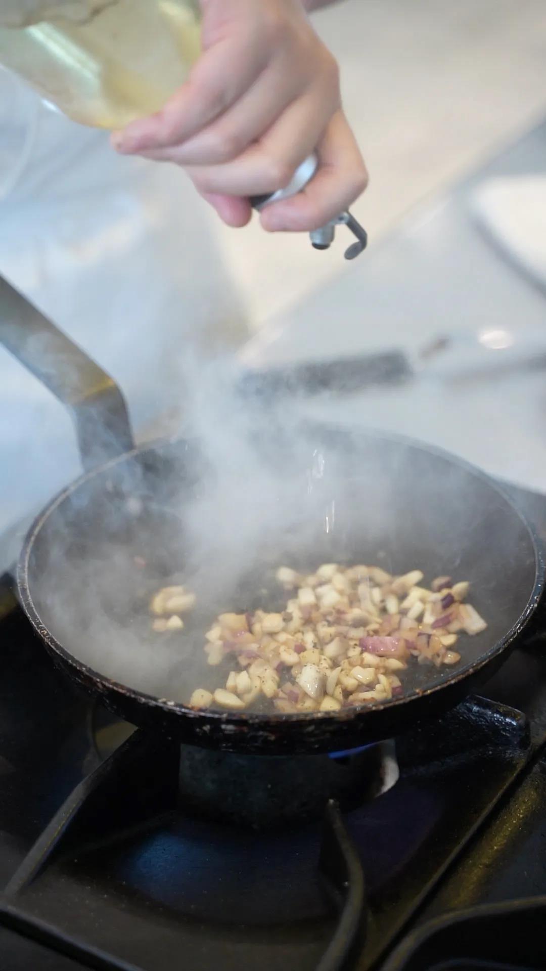 ④ 锅中放油,加入切碎的洋葱炒香,加入蘑菇炒透。再加入、胡椒、白酒捞出。