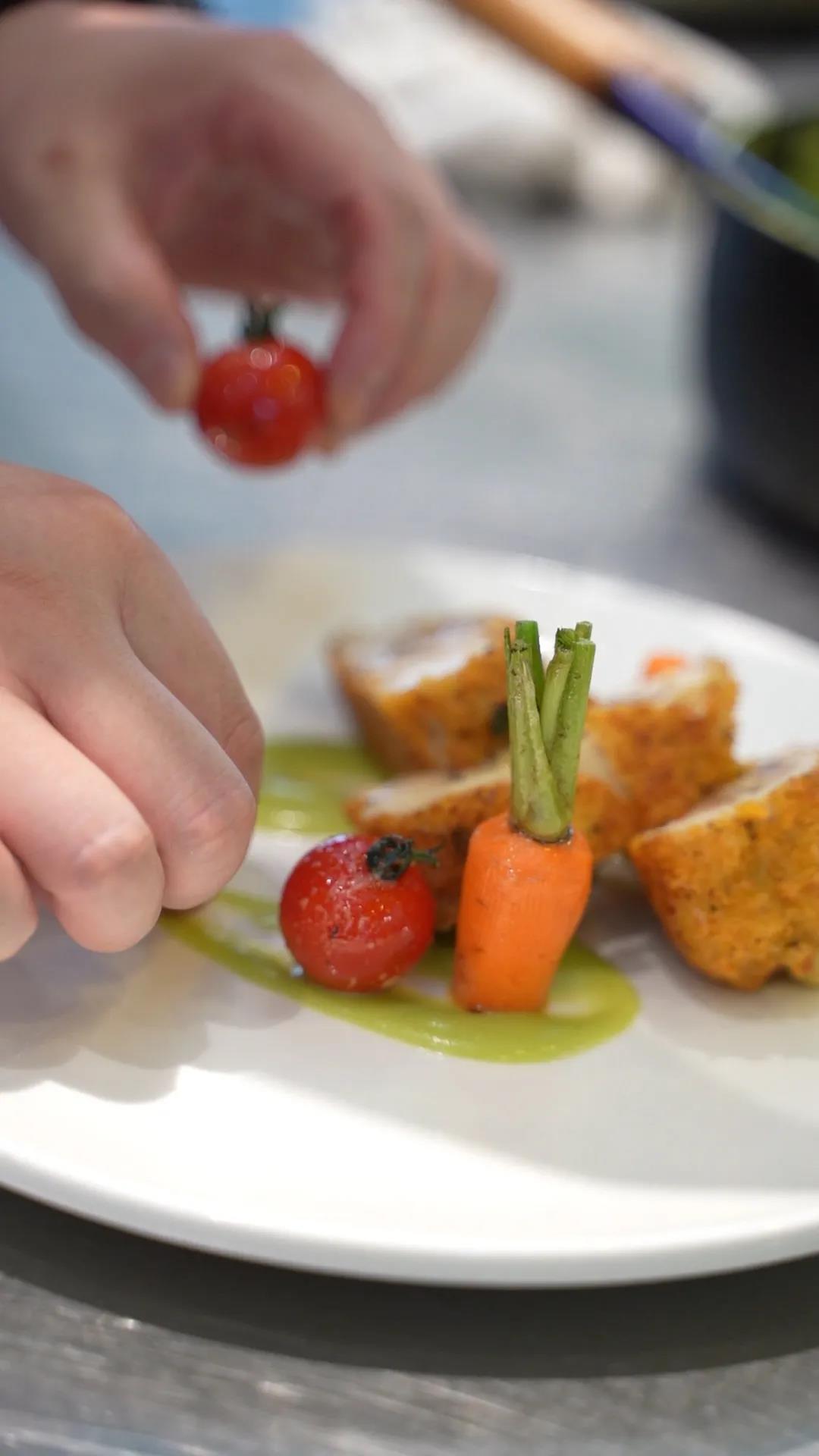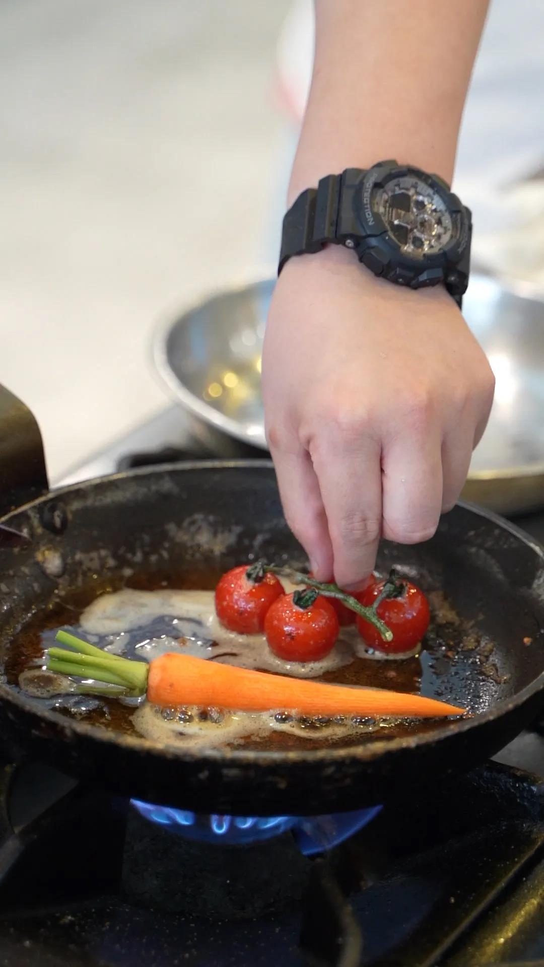 ⑧ 做蘑菇汁,小番茄和迷你胡萝卜焯水之后用黄油煎一下。