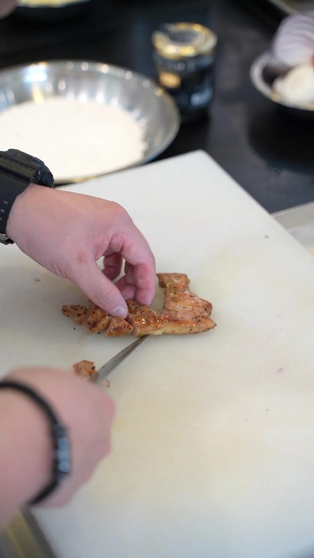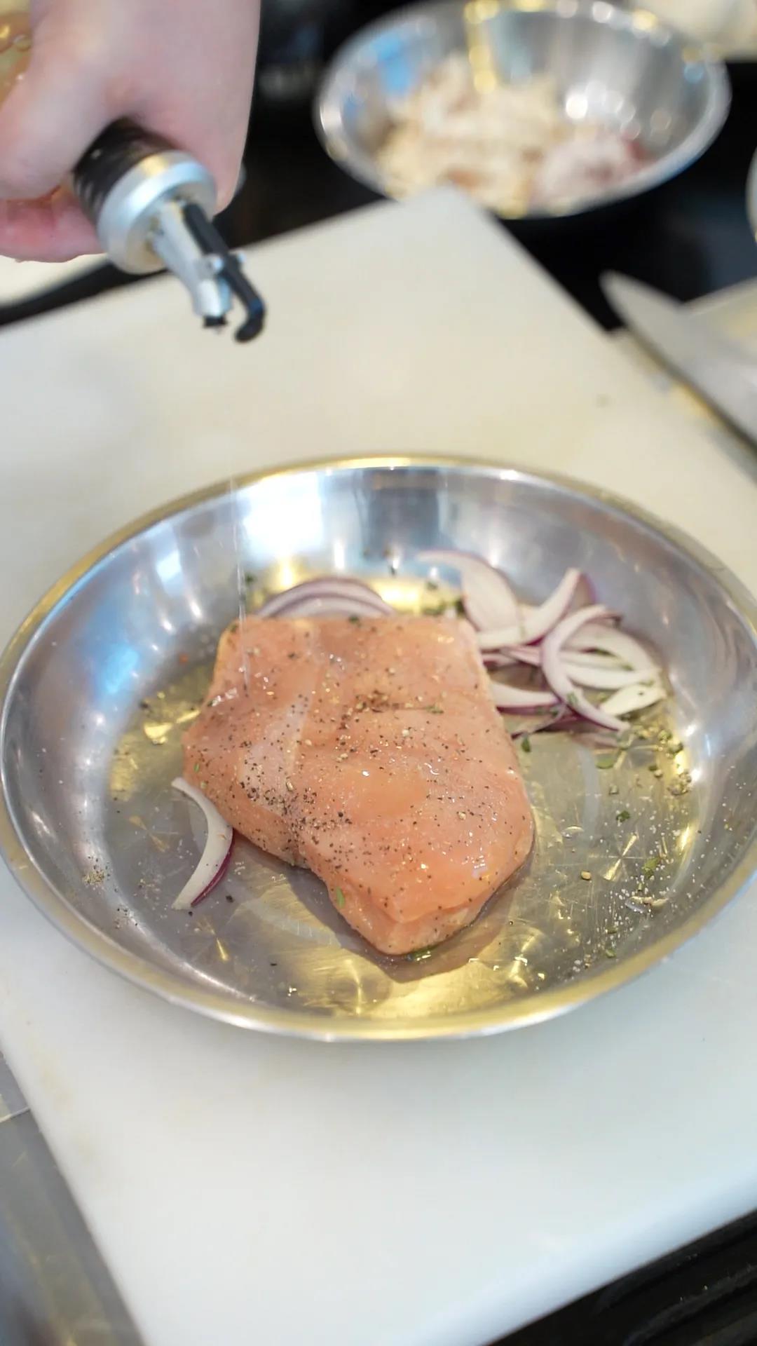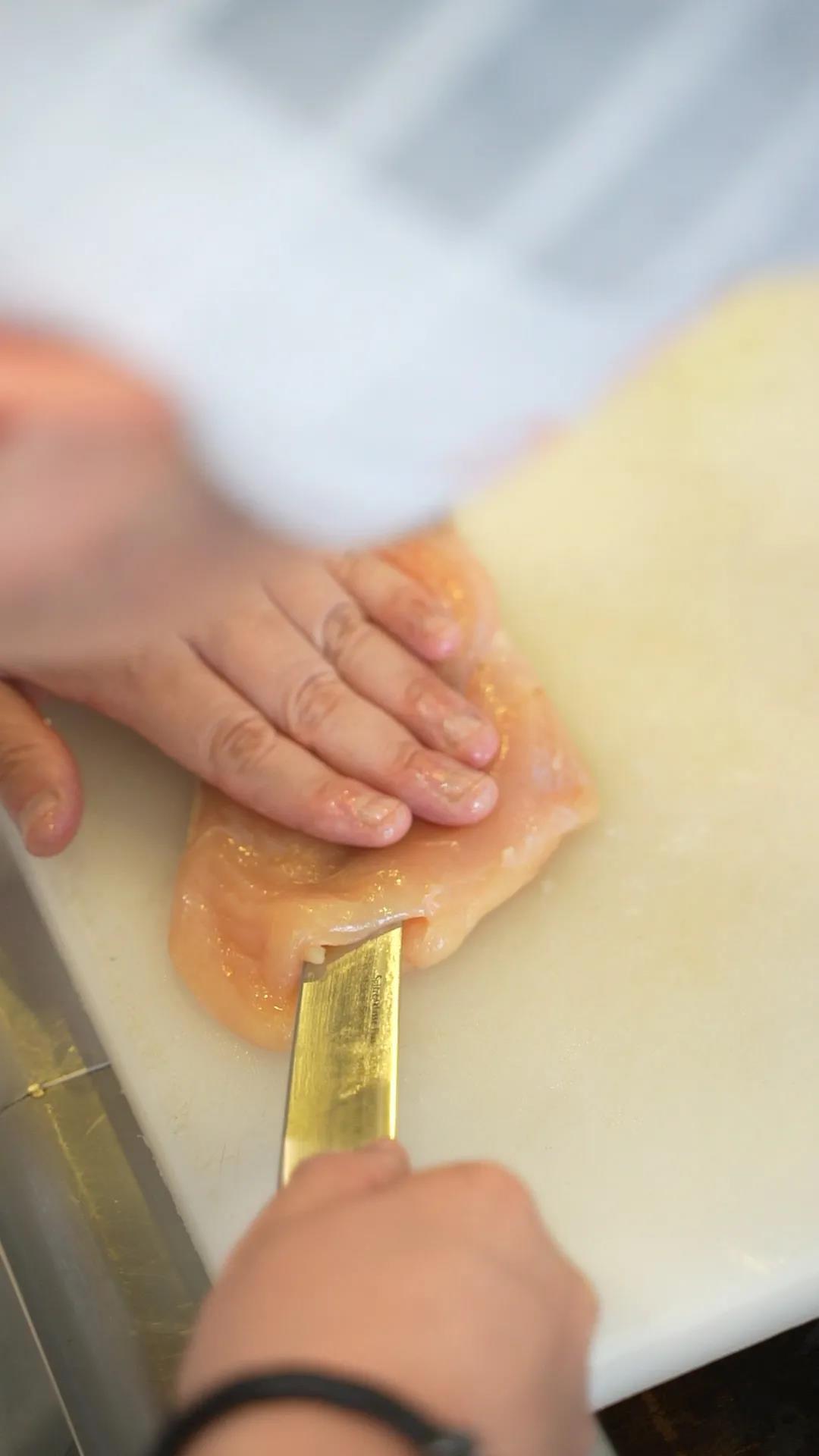 ① 鸡胸肉改刀开袋,盐、胡椒、白酒、百里香、腌制。
