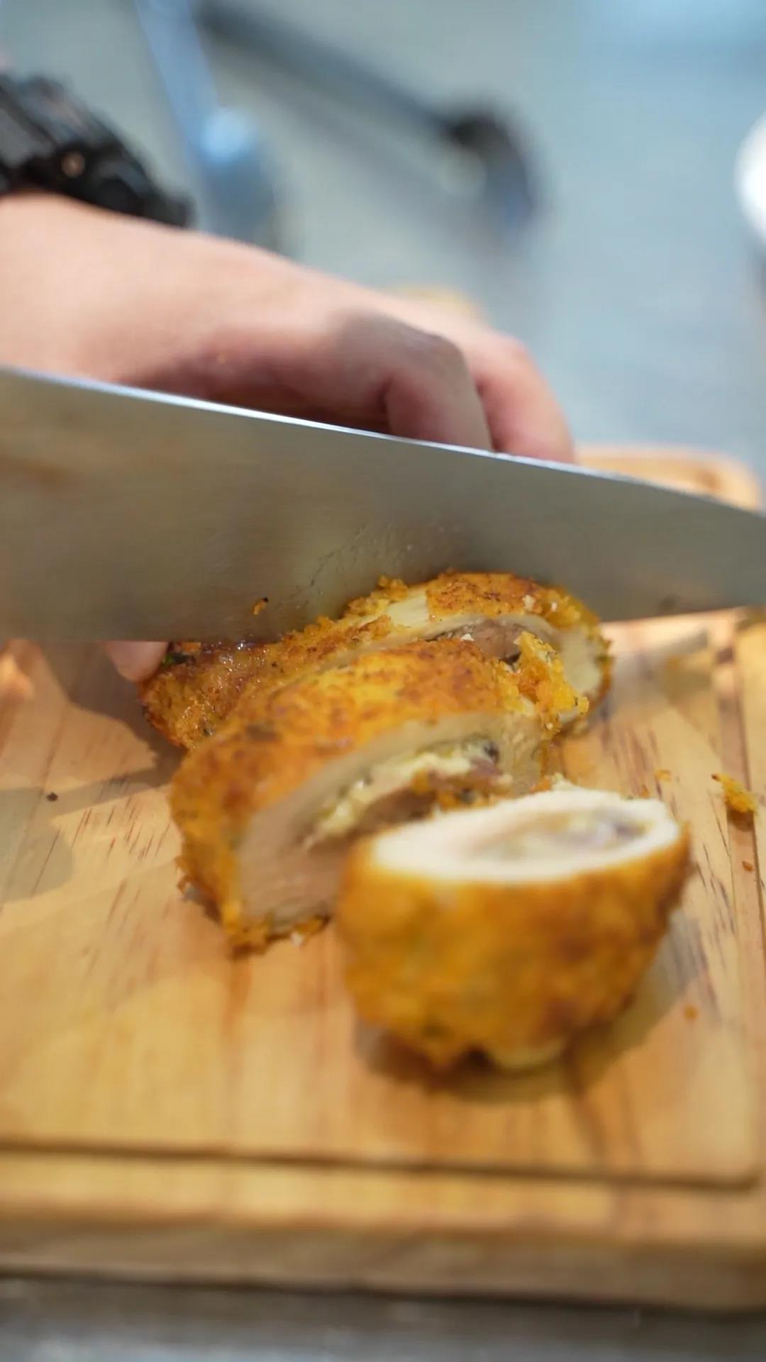 ⑤ 将鹅肝和炒蘑菇塞入鸡胸肉中,再塞入马苏里拉芝士。
