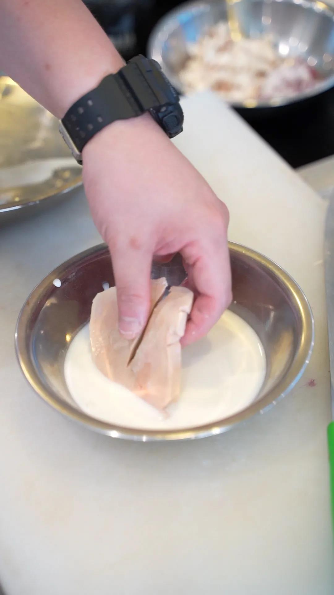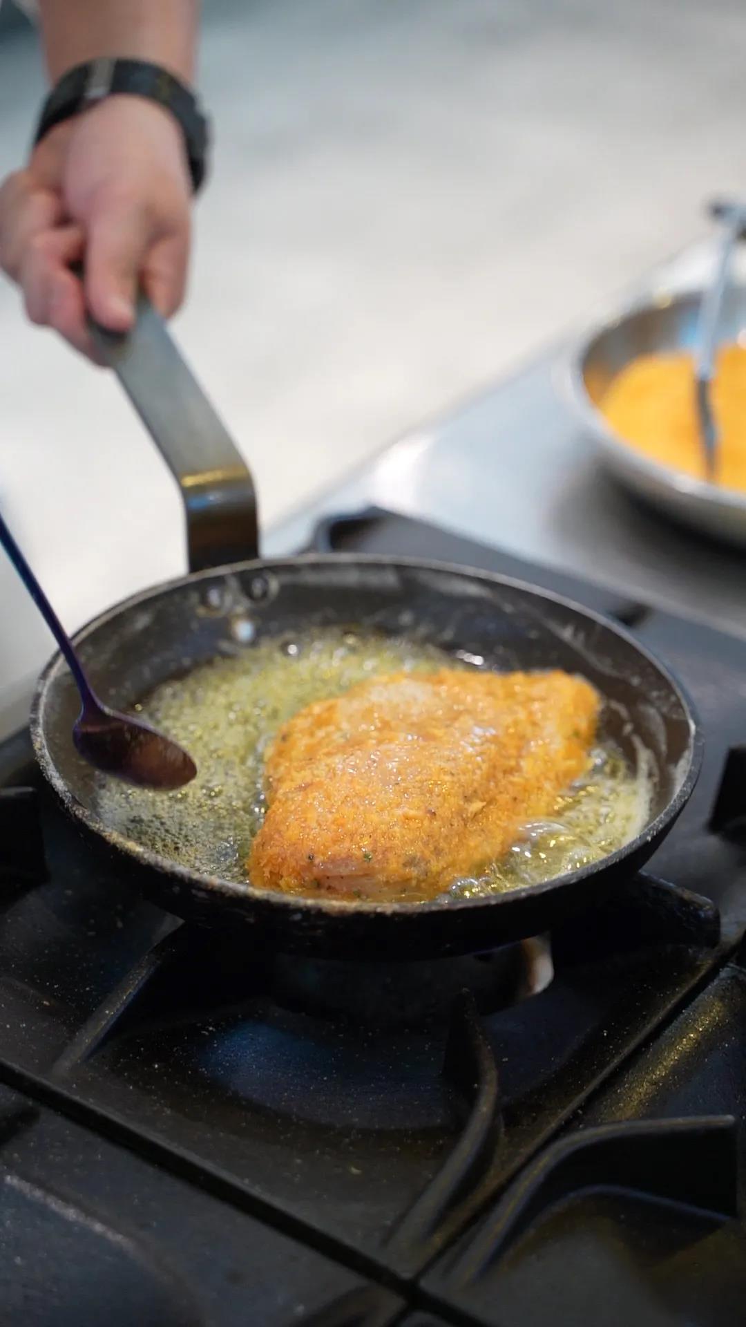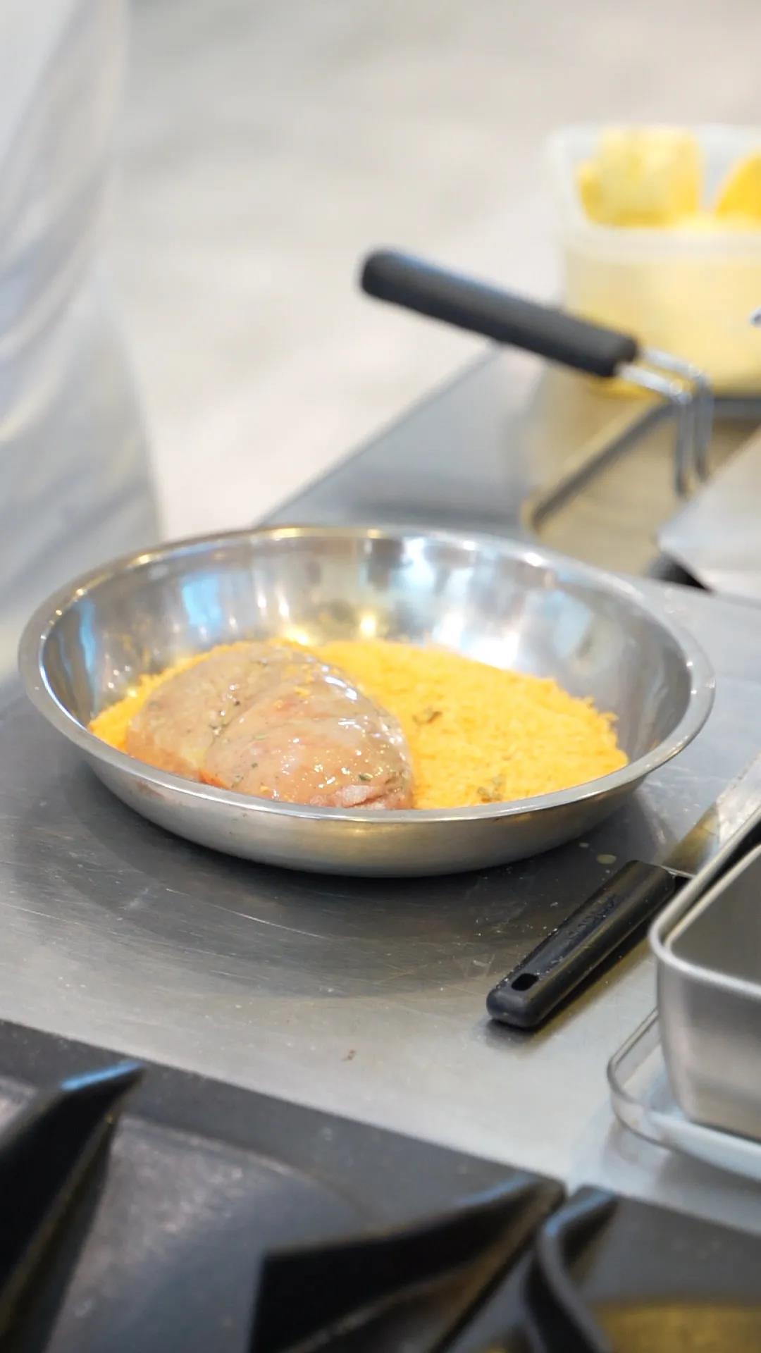 ⑦ 鸡胸肉裹上面粉,裹上蛋液,裹上面包糠。用黄油煎,法式煎法。进入烤箱200度,烘烤4分钟。