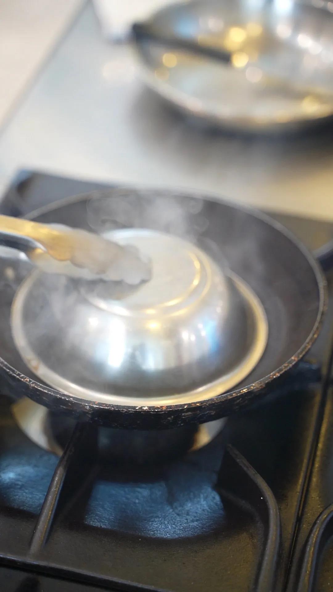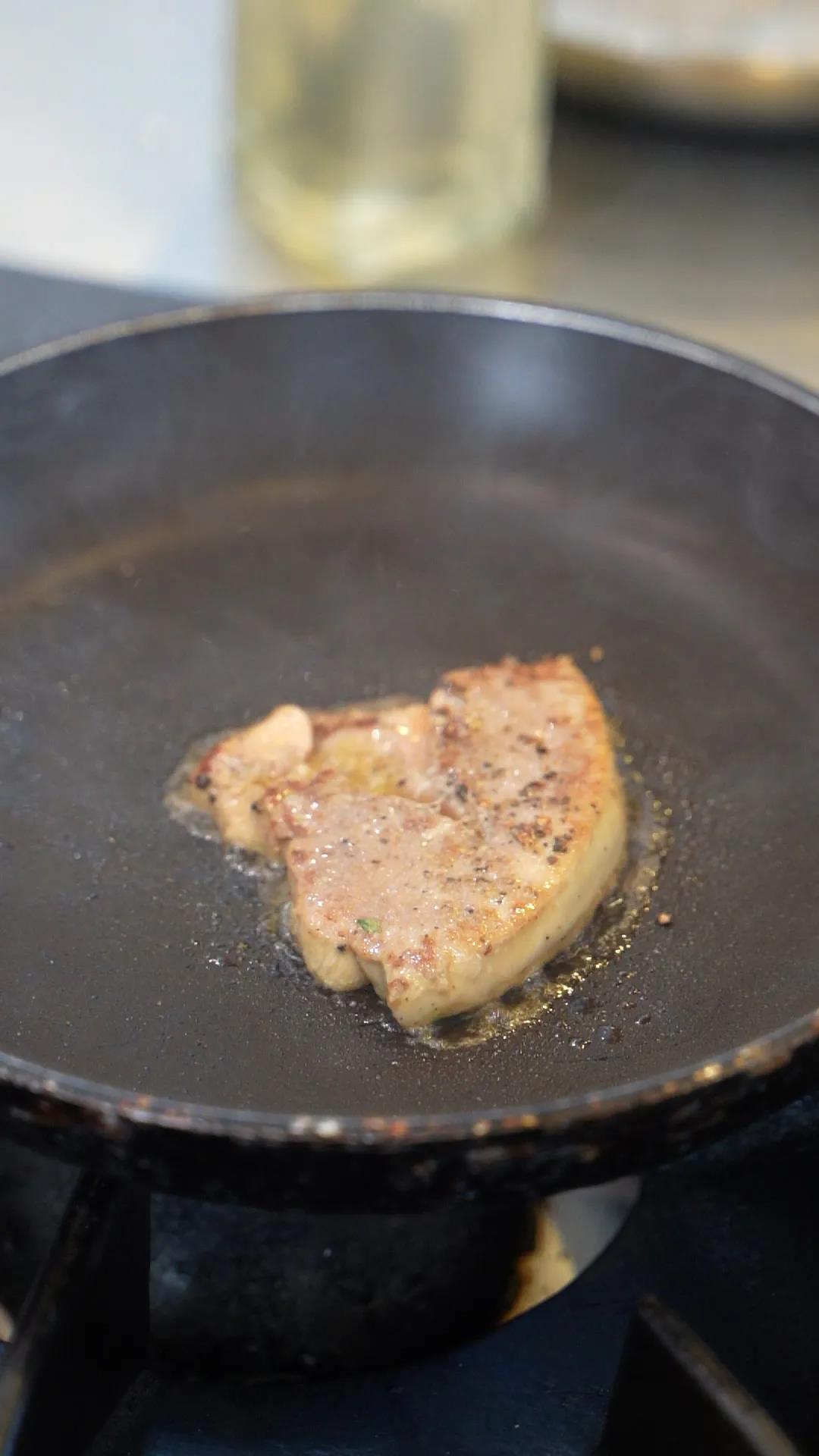 ③ 煎鹅肝,喷入白酒盖住鹅肝(不让香味跑掉)(白兰地),出锅后将鹅肝切块。