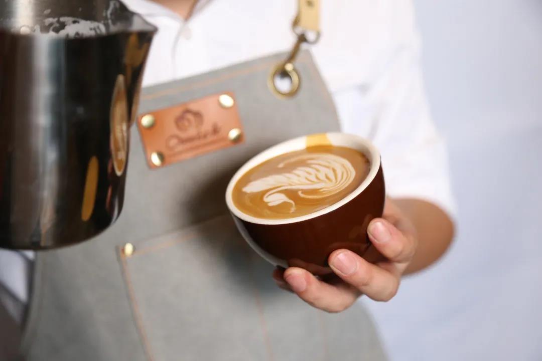 倾斜咖啡杯,以画圈方式在杯中注入奶泡,融合至咖啡杯五分满;