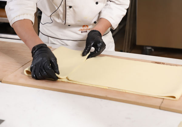 5.对折后,冷藏15-20分钟,取出擀开,在4折法对折,然后擀开3折对折。放冷藏30分钟松弛。