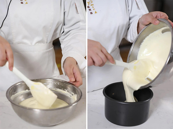 4.蛋黄糊+蛋白霜翻拌匀,注入戚风模具烘烤 温度 160/150 40min;