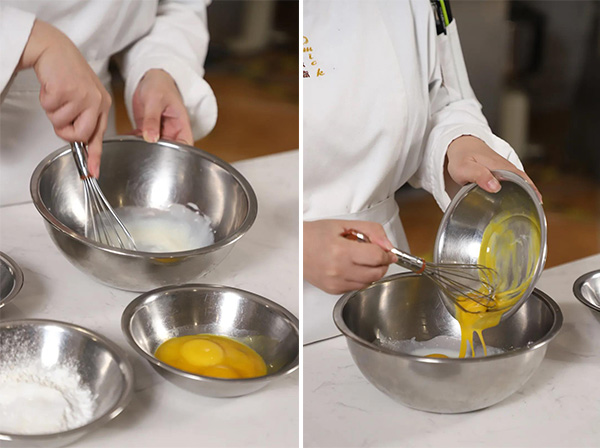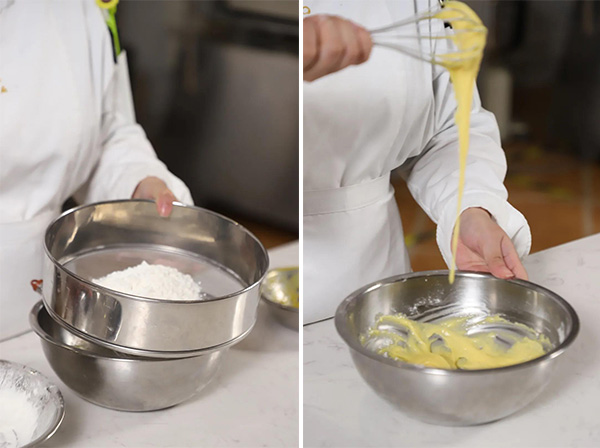 2.1+过筛的低粉,淀粉,泡打粉,拌匀,加入蛋黄拌匀备用;