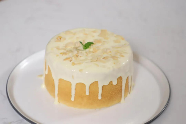 9.继续在表面挤上奶盖酱,并在边缘处慢慢挤上,使奶盖沿着边缘流下,呈现淋面状。铺上烤好的杏仁片即可。