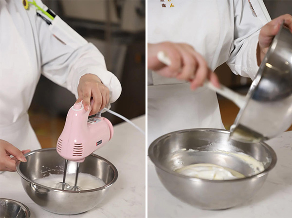 3.蛋清加糖加塔塔粉打发至弯钩状;