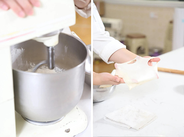 1、将所有材料(除奶油外)一起搅拌至面团表面光滑有弹性。加入奶油,慢速搅拌均匀后,再用快速搅拌。